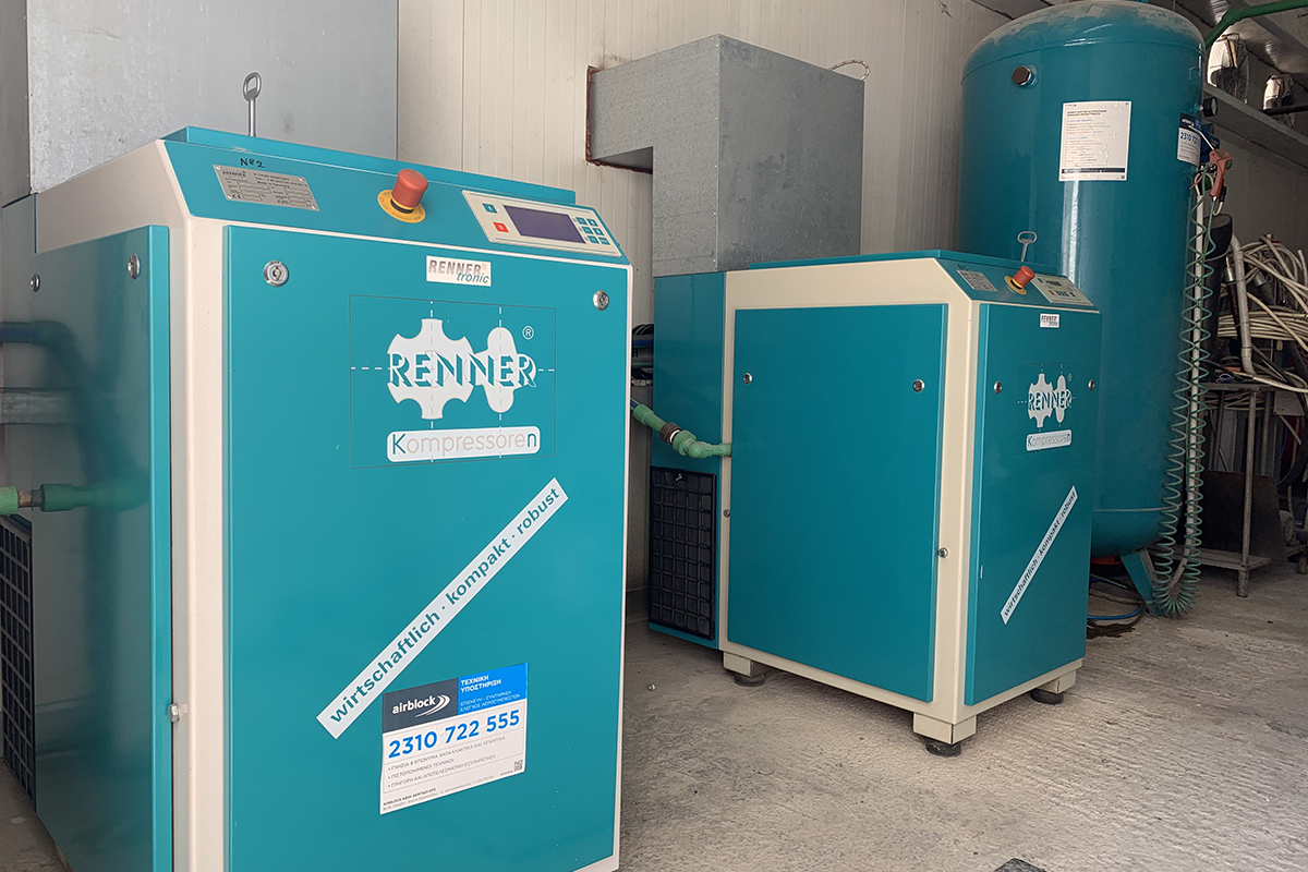 Μεγάλη εγκατάσταση συστήματος παραγωγής πεπιεσμένου αέρα 30kW από την Airblock σε μονάδα κατασκευής και εμπορίας κτηνοτροφικού εξοπλισμού. Στην παραπάνω εγκατάσταση βλέπετε δύο κοχλιοφόρους αεροσυμπιεστές RSF 15 RENNER με 20HP ο καθένας.
