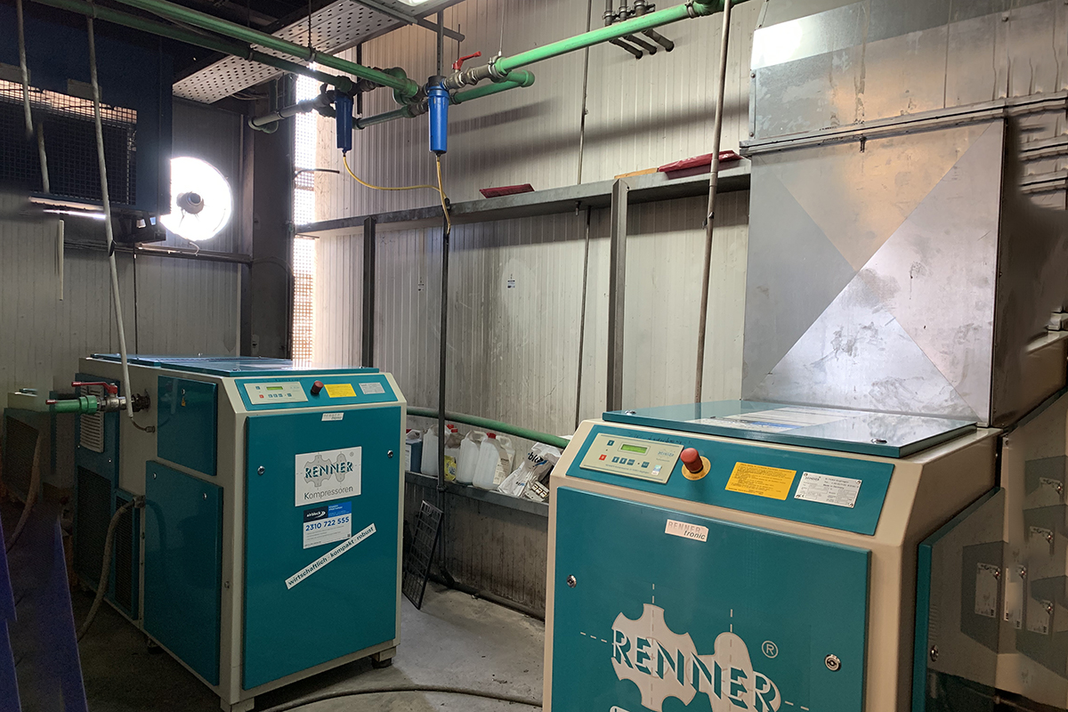 Μεγάλη εγκατάσταση συστήματος παραγωγής πεπιεσμένου αέρα 60kW από την Airblock σε μονάδα κατασκευής και εμπορίας κτηνοτροφικού εξοπλισμού. Στην παραπάνω εγκατάσταση βλέπετε δύο κοχλιοφόρους αεροσυμπιεστές RSF 1-30 RENNER με 40HP ο καθένας.