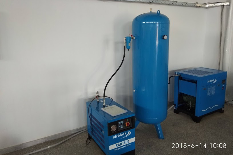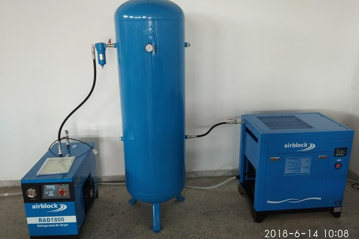 An AIRBLOCK screw compressor with a production capacity of 1,000 lt / min was installed by our specialist technicians in a mop production unit for machine feeding. In conjunction with the compressor, we connected a 500 liter upright receiver, an AIRBLOCK prefilter & a dryer to achieve a first air purification before entering the air network.
