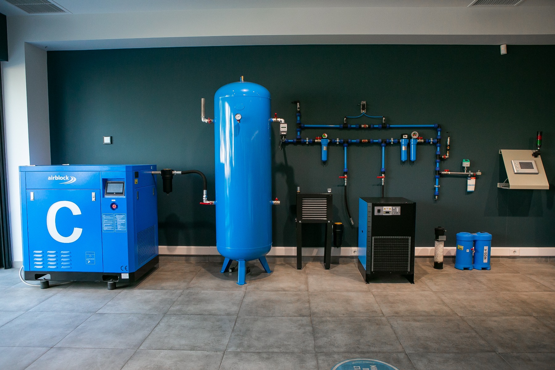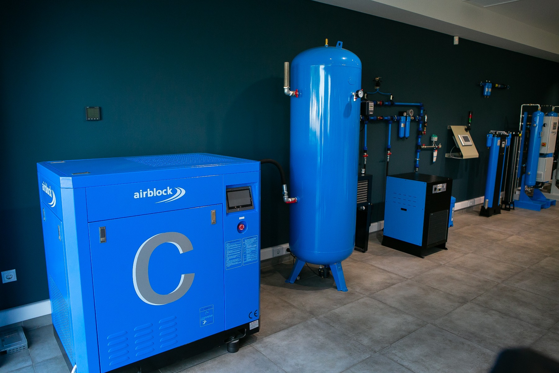 Στο κατάστημά μας, σε πλήρη πρόσβαση για το κοινό και σε πλήρη λειτουργία για την κάλυψη των αναγκών παραγωγής της AIRBLOCK, ολοκληρώσαμε την ιδανική βιομηχανική εγκατάσταση πεπιεσμένου αέρα. Κοχλιοφόρος αεροσυμπιεστής 15kW με κινητήρα μόνιμου μαγνήτη, inverter, μετάδοση απευθείας σύμπλεξης και οθόνη αφής, τροφοδοτεί αεροφυλάκιο 900 lt & στη συνέχεια οδηγείται μέσω by-pass σε φίλτρα & ξηραντή ψυκτικού τύπου OMEGA ώστε να πέσει το σημείο δρόσου στους 3ο Ctd.